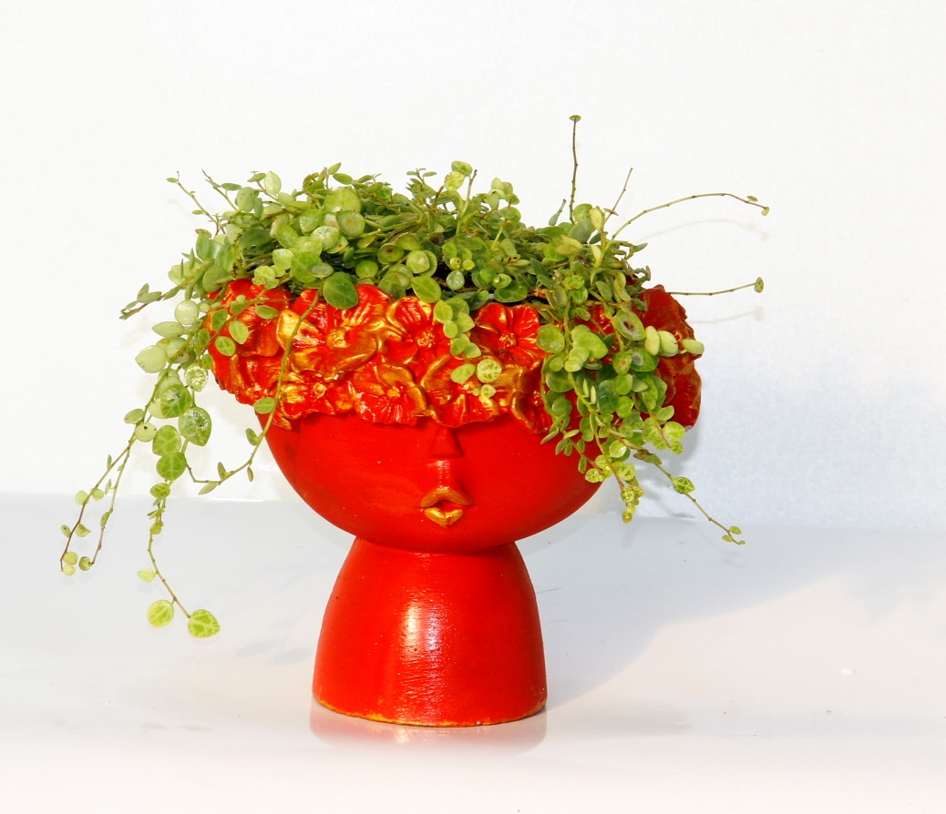 KIRMIZI 'YARIM YÜZ' ve 'ÇİÇEK' MOTİFLİ EL YAPIMI BETON SAKSIDIR, OLDUKÇA DAYANIKLIDIR